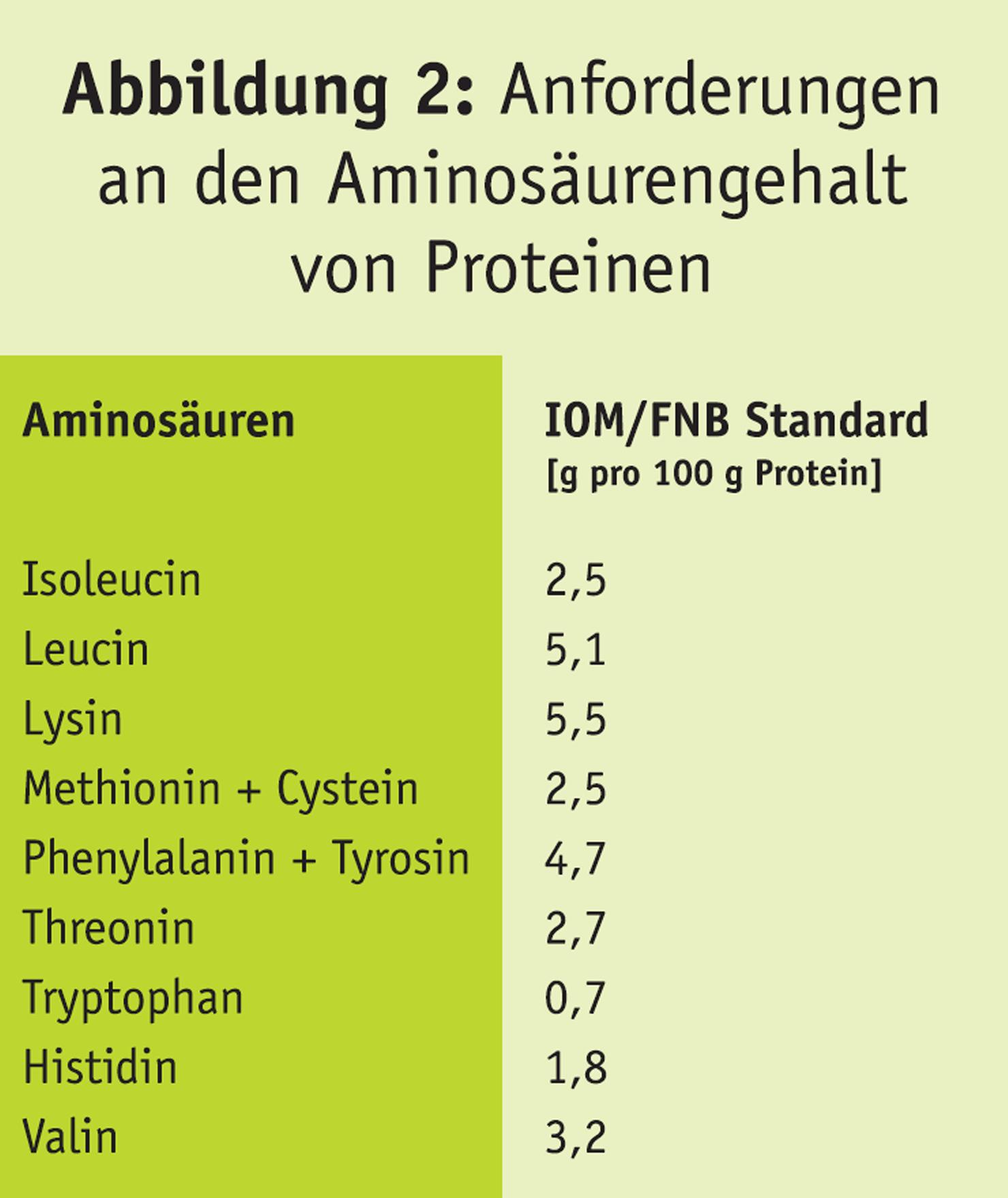 Aminosäurengehalt von Proteinen gemäß den Vorschlägen des Food and Nutrition Board (FNB) of the Institute of Medicine (IOM) vergleichen (-> Abbildung 2).