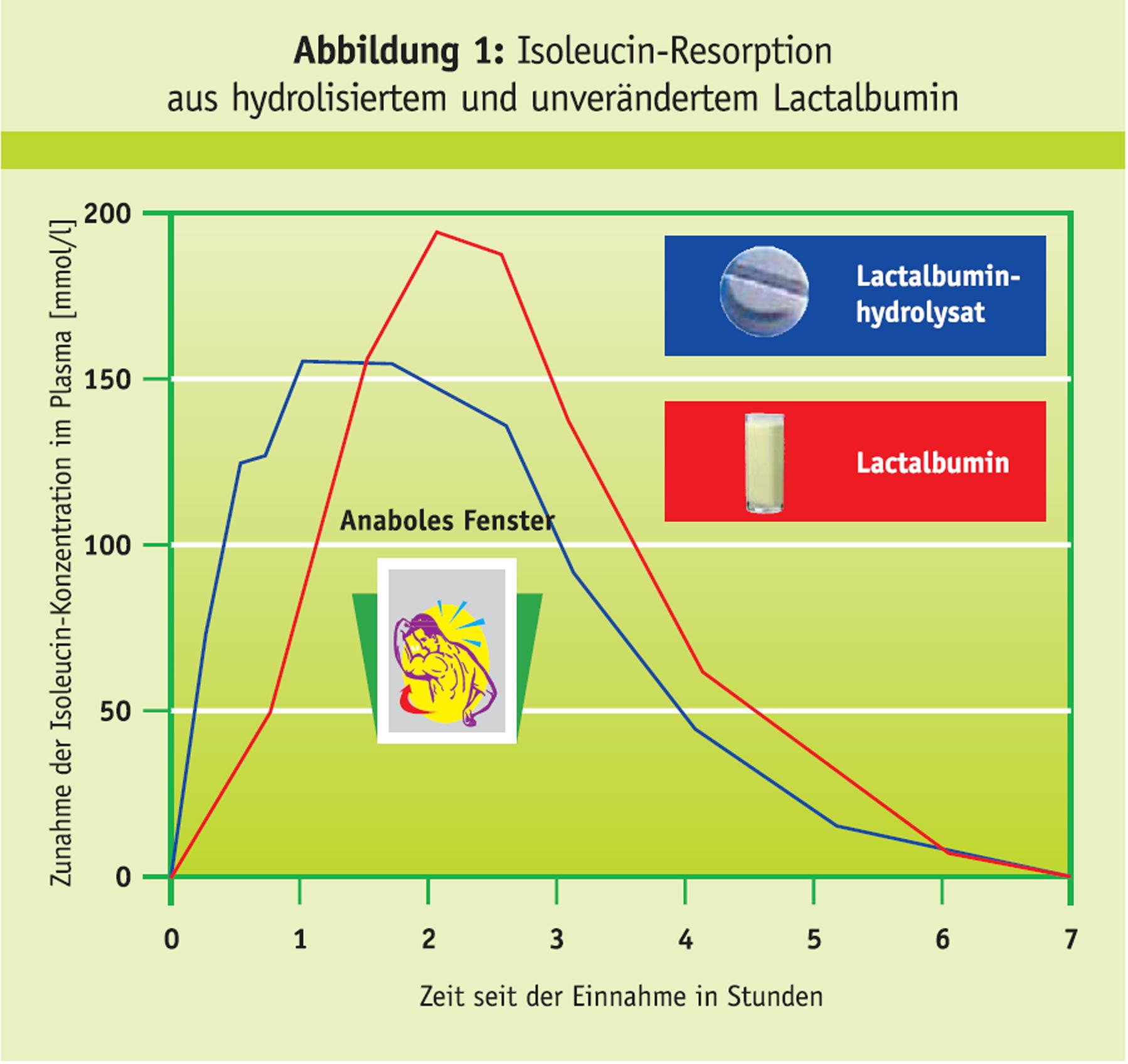 Abbildung 1: Isoleucin-Resorption aus hydrolisiertem und unverändertem Lactalbumin (aus Moch und Kübler); Graphik – PAGE werbungmarketing.design